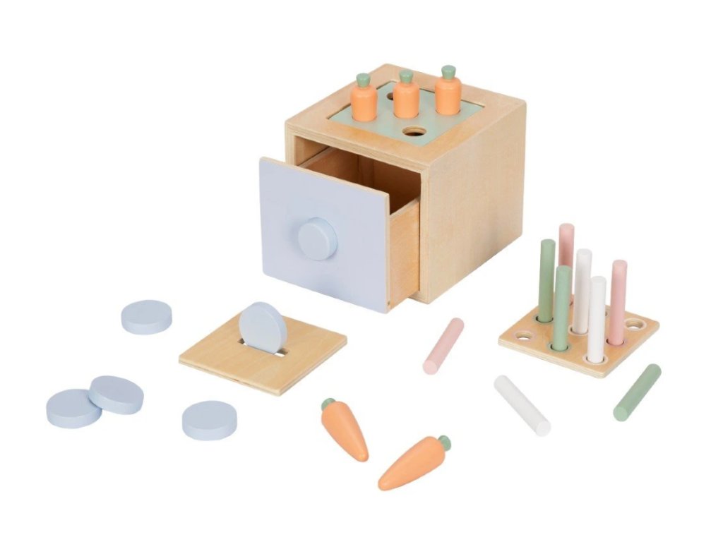 Dřevěná edukační hračka (box), pro děti od 1 roku, představuje hned 3 hračky v jednom. Multifunkční bedýnka (box) s výměnitelným horním dílem je zábavnou vkládačkou s mrkvičkami, s barevnými válečky nebo pokladničkou. Díky 3 výměnitelným destičkám děti mohou hrát různé hry, zdokonalovat své dovednosti a užít si spoustu legrace.