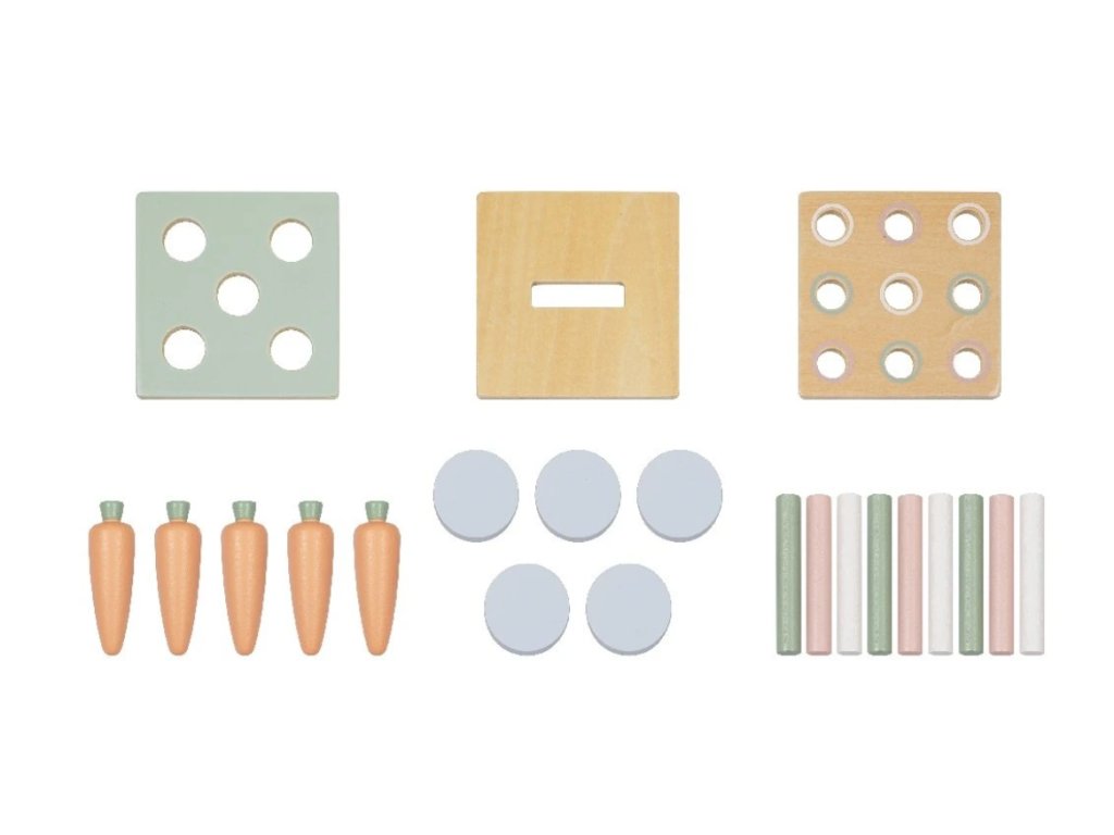 - Upozornění: Balení obsahuje celkem 24 dílků (1 box, 1 šuplík, 3 výměnné destičky, 9 barevných válečků, 5 žetonů, 5 mrkviček), nikoli 26, jako je uvedeno na balení.