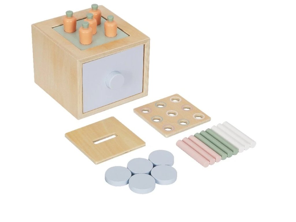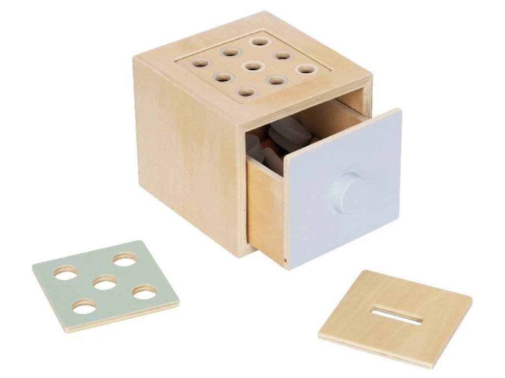 - Malý šuplík - díky praktickému šuplíčku děti snadno z kostky vyjmou obsah, který do ní naházely - barevné válečky, modrá kolečka. Hra tak nikdy nekončí.