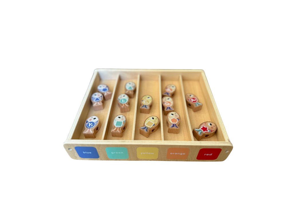 Dřevěná hra Rybaření v krabičce baví děti od 18 měsíců, rozvíjí jemnou motoriku i koordinaci očí a rukou. Děti mohou s motorickou hračkou chytat rybičky, navlékat je a třídit, používat pinzetu, přičemž vše snadno uklidí do praktické krabičky.